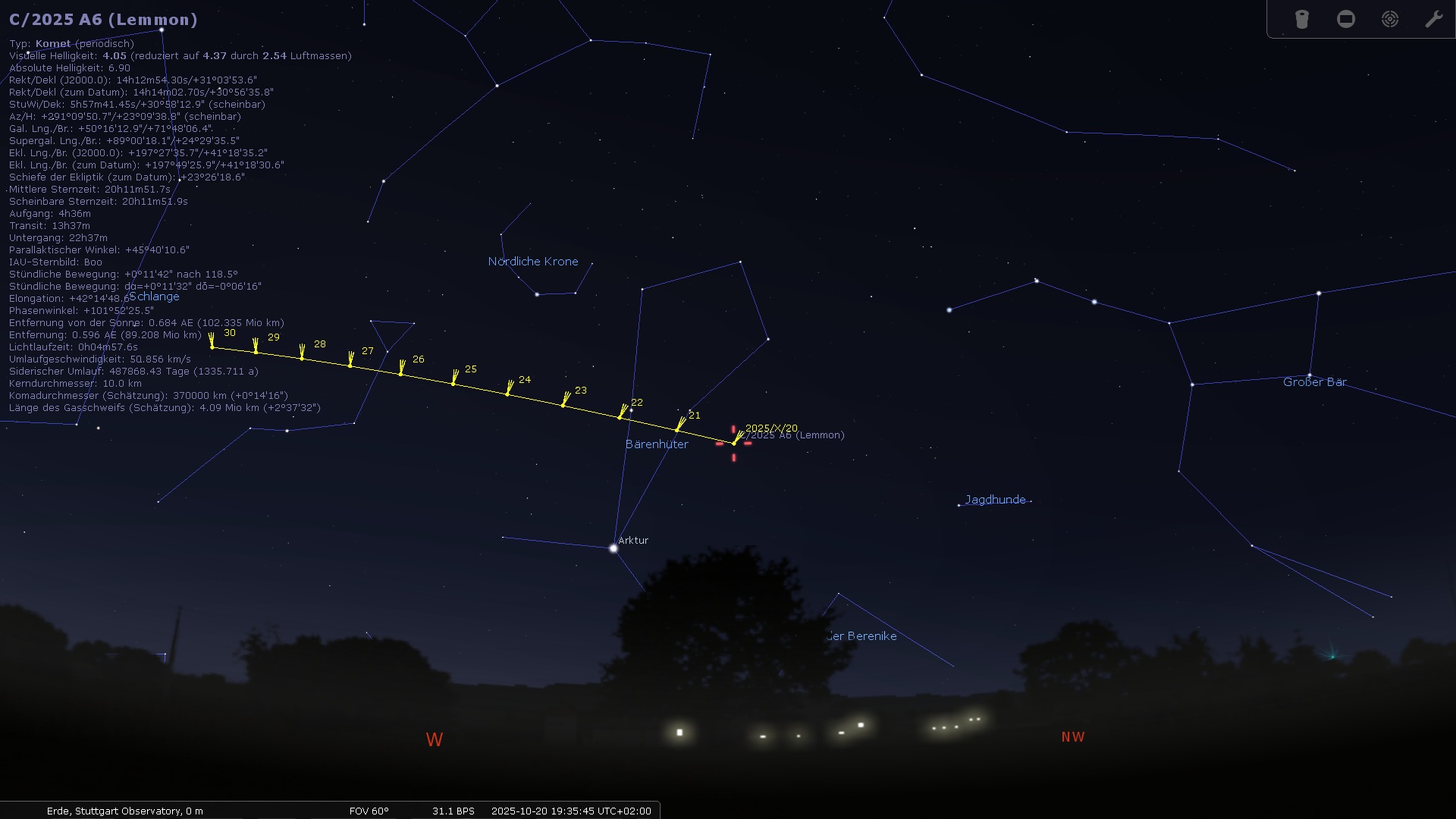 Der Komet bewegt sich auf einer stark geneigten, retrograden Bahn (ca. 143° zur Ekliptik) und kommt der Erde am 21. Oktober 2025 bis auf etwa 89 Millionen Kilometer nahe. In dieser Zeit dürfte er seine größte Helligkeit erreichen – voraussichtlich zwischen +3,0 und +4,0 mag, sodass er möglicherweise mit bloßem Auge aber, auf jeden Fall, im Fernglas sichtbar sein wird.