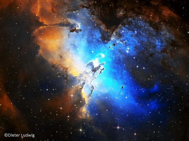 Hier meine Ausarbeitung dazu, welche mich sehr viel Zeit gekostet hat und mir erst nach dem vierten Anlauf gelang. Ich spare mir hier die weiteren Erläuterungen zu diesem Objekt, da sich im Netz unzählige Informationen darüber befinden. Da die Säulen der Schöpfung im Gesamtbild relativ klein erscheinen, habe ich das Bild sehr stark beschnitten damit der Nebel besser zur Geltung kommt. Ferner habe ich es so gedreht, dass die Ausrichtung demjenigen des JWST gleicht. Im Bild sind auh mehrere Bok-Globulen zu sehen. Hierbei handelt es sich um dunkle Flecken vor dem Hintergrund des Emissionsnebels, welcher hier blau erscheint. Sie wurden 1947 von Bart Bok als ein Frühstadium der Sternentstehung vorgeschlagen. Dabei erhitzen sich Protosterne im inneren einer Globule immer weiter, bis sie heiß genug für eine Kernfusion sind.