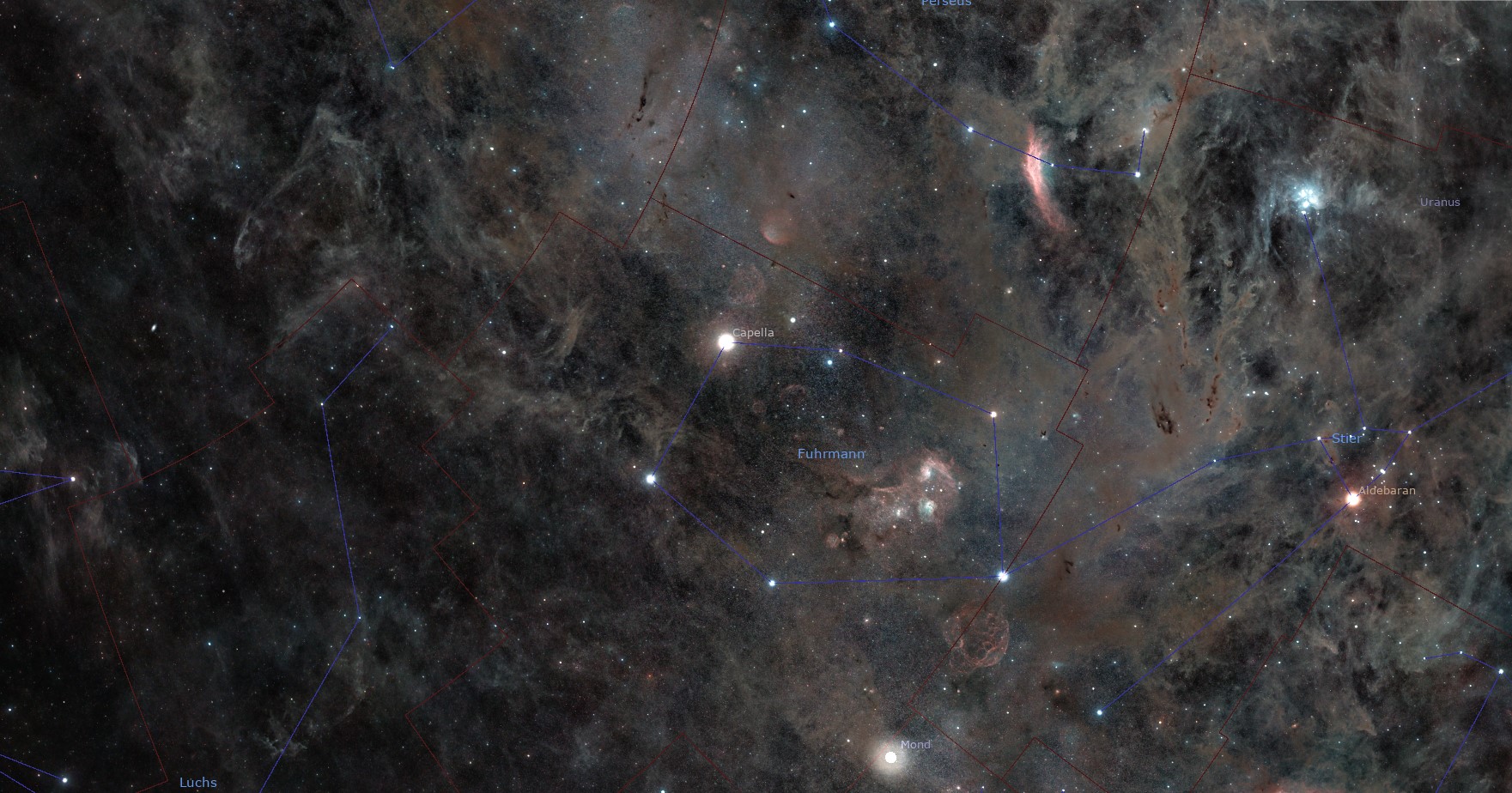IIC 405, der Flammensternnebel, liegt in befindet sich in einer Entfernung von 1400 LJ im Sternbild Auriga (Fuhrmann). Hierbei handelt es sich sowohl um einen Emissions- (rot) als auch Reflexionsnebel (blau). Verantwortlich für beide Nebelarten ist der variable Stern AE Aurigae, ein O-Stern und einer Oberflächentemperatur von 36.500K! Ursprünglich stammt er aus einer OB-Assoziation in der Orionregion. Vermutlich wurde er durch eine dynamisch Interaktion aus einem Sternhaufen herausgeschleudert. Er bewegt sich mit relativ hoher Geschwindigkeit durch die Region. Die Helligkeit des Nebels liegt bei 10 mag, daher ist er mit bloßem Auge nicht zu sehen, sondern nur in Teleskopen bzw. Aufnahmen. Links unten im Bild liegt noch der Reflexionsnebel IC 410 (Kaulquappennebel) mit den "Tadpoles", welcher bereits als Objekt des Monats März 2025 vorgestellt wurde.
